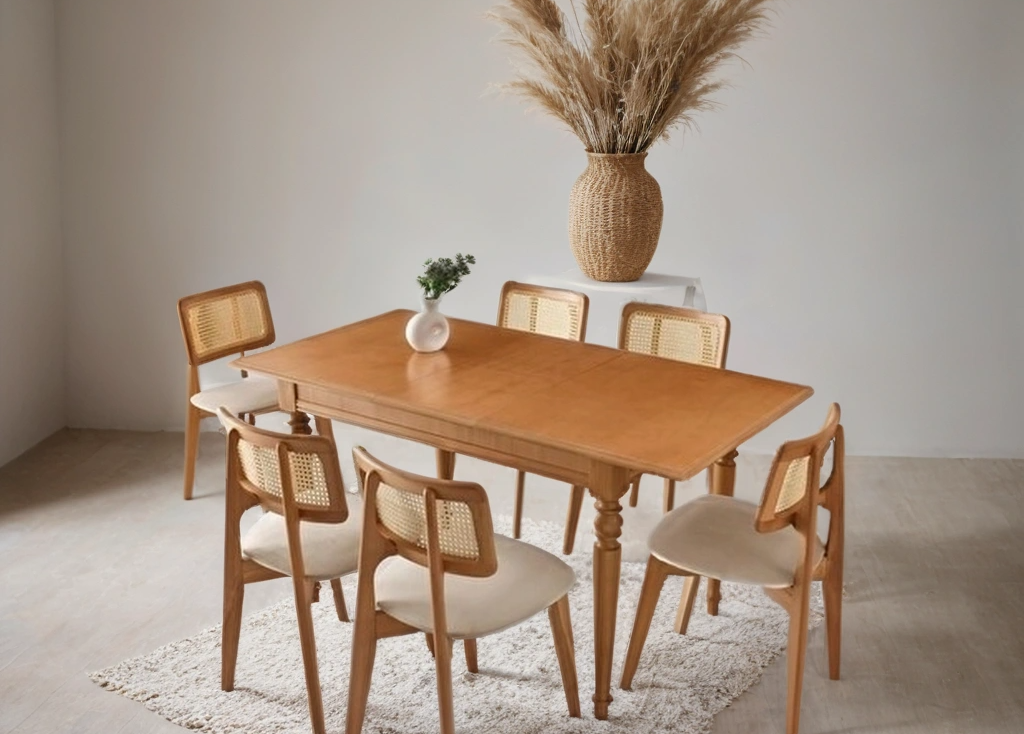 میز و صندلی ناهارخوری با طراحی خاص و منحصر به فرد، ترکیب چوب راش و صندلی‌های حصیری است که جلوه‌ای زیبا و طبیعی به فضای شما می‌بخشد. این مجموعه شامل دو مدل مختلف میز، یکی مدل بامبو و دیگری پایه شیاری، است که می‌توانید بسته به سلیقه خود انتخاب کنید. چوب راش به کار رفته در این میز و صندلی‌ها، علاوه بر زیبایی، استحکام و دوام بالایی دارد. رویه صندلی‌ها با پارچه لینا پوشانده شده که نرمی و راحتی را فراهم می‌آورد، و تشک صندلی‌ها از اسفنج با چگالی ۳۰ کیلو ساخته شده که برای نشستن طولانی‌مدت بسیار راحت است. این میز و صندلی‌ها در رنگ‌بندی‌های مختلف قابل سفارش بوده و می‌توانند با هر دکوراسیون داخلی هم‌خوانی داشته باشند.